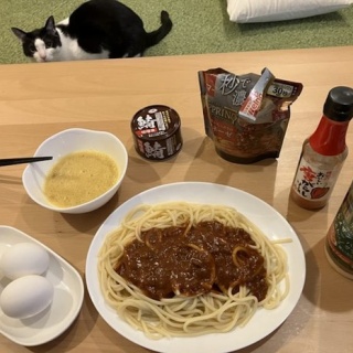 1 :名無しさん@おーぷん 26/01/15(木) 19:53:05 ID:wK0q ボロネーゼパスタ140g生卵1と納豆1パックを混ぜたものゆで卵3個さばの味噌煮込み缶粉チーズ、唐辛子ソース、ほか調味料たぶん総計900円くらいあと猫