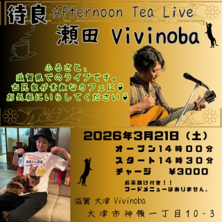 『瀬田 Vivinoba Afternoon Tea Live』📍2026年3月21日(土)◎ 会場|滋賀 瀬田 @ Vivinoba◎ 開場 14 : 00/開演 14 : 30◎ 料金 3,000円+1ドリンク ※フードはありません。◎ 出演 〉待良