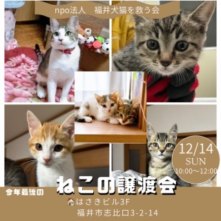 🐾保護猫多数!🐾今年最後の譲渡会です。約十数匹が参加予定🐈 この子たちを、あなたの家族に迎えてみませんか?✨皆さまのご来場をお待ちしています✨いつもご支援ありがとうございます。12月の譲渡会のご案内です。 開催2日前の金曜日には、 福井新聞ミニ広告欄にも掲載いたします。 混雑をさけるために、ご入場制限がございますので、 ご予約をおすすめいたします。ホームページもご確認ください>>12月14日(日)午前10時から12時まで福井市志比口3丁目2-14 はさきビル 3階 ・当日は 20組 までのご入場です。 ・一度に5家族(1家族 4名様まで)ご入場可能です。・会場内での滞在時間は 1家族 30分です。・予約時間はこちらで指定させていただきます。・譲渡は先着順ではございません。 ・予約された方は、 必ず時間通りにご入場をお願いします。 ・駐車スペースに限りがあります。 積雪がある場合はさらに狭くなり、 長くお待ちいただける場所はありませんので 指定させていただく時間にお越しくださいませ。 ・歩道や路上駐車、近隣のスーパーへは 車をお停めにならないようお願いいたします。ご予約希望のかたは 070-5630-2429 まで*譲渡会中の電話対応はいたしかねます。 当日のお問合せ電話はご遠慮ください。 ================== 12月14日(日)午前10時から12時まで福井市志比口3丁目2-14「はさきビル」3階 *会場は保護施設ではございません。 *先着順の譲渡ではございません。*当日の電話問合せはご遠慮ください。==================現在、新しい家族を募集している、 猫たちの最新のページはこちらです>> 福井犬猫を救う会 >> ご支援のおねがい>> .