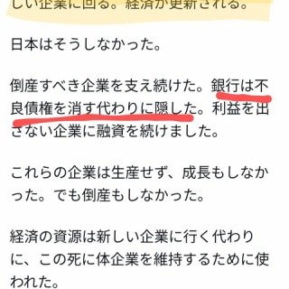 日本衰退の経緯説明https://x.com/i/status/2045219848725139839 https://x.com/i/status/2045219848725139839画像の部分ここに同意しかねるが、これは正しいのか間違っているのか?「貸し剥がし」や「貸し渋り」もあったはずで、生かされたゾンビが多くの企業だとは思わないこれらは辿ると公金を使える所にぶら下がった腐った実なのではないだろうか?●日経225 上場企業●その他中小零細企業企業数、従業員数「利益」で比較するのが適切なのか意図的な利益隠しもあるだろう経済ウェイトを大まかに比較したい企業数225 2 中小零細企業 8のようなまとめ方は可能か?もう一つは雇用形態ではないか?派遣と斡旋企業問題従業員数は中小零細企業が圧倒的業績は半々労働者=消費者その源泉である所得が上がらないアベノミクスの果実はどこへ?ファストリ→海外生産ゼンショー→低賃金重労働(改善有)いまだ多数の非正規雇用そして消費税労働者=消費者を痩せ細ろえる方向性にしたら、そりゃこうなるだろ?餌もやらない鶏の卵ばかり盗んで一時的に飼い主の財布は厚くなるかもしれんが死んだらそれまでだ外から足したらいいという考えかもしれんがな根本的な問題ゾンビがなぜゾンビなのか?ではゾンビ企業潰したら本当に「労働力の流動性」は起きて効率化された経済になるのかその時、経済は改善したとしても社会保障が上がれば、その負担は減った「現役世代」が背負うゾンビ企業延命の為の経済政策だったの?複合要因で、それぞれが複雑に絡む上で示した例でも明らか日銀のゼロ金利政策これによる円キャリートレード誘発コロナ、ウクロによるインフレ重なった結果、悪い方に転がって財政正常化!のもと、税金社会保障ばかり引き上げたそりゃ納税者=消費者は痩せるよねといやさ再就職支援するなら「ソンビ企業」に健全経営させるような行政指導をするほうが手間が少ないんじゃない?雇用の流動性は、本質的にそのレベル内でしか起こらないし潰す必要のある会社と肩を並べる会社もまた潰されかねない会社さらにそこに従事する人達も同じ穴のムジナどうだろうか?grokに否定的な意見ですまないがさ私の見解に対するgrokの回答がそのまま解決にも解決不能にも働くのよ潰す会社の会社員を再教育して潰さなくて良い会社へ就職させるそれが出来るなら、会社を変える事も可能なのではないの?という視点なのよ会社の構成要素は労働者で会社負担で一番重いのが賃金という固定費だgrokはクエリに対してなんとか論理的な解法を提示しようと努力してくれてるけど私はどちらのアプローチも基本構造を鑑みたら無理じゃね?と思っているそれこそ「鶏と卵」だhttps://x.com/i/grok/share/54c1e3d0412840c797a95afa21567078 https://x.com/i/grok/share/54c1e3d0412840c797a95afa21567078