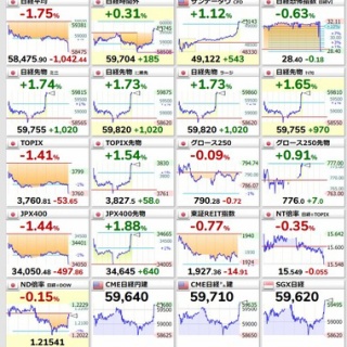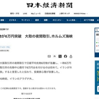1 : 日本時間17日夜の大阪取引所の夜間取引で日経平均先物6月物が急騰し、一時6万円を突破した。 大阪取引所の先物中心限月で6万円台を付けるのは初めて。 イランがホルムズ海峡を「開放」すると宣言したと伝わり、投資家心理が改善した。 全文はソースで 日経平均先物が初の6万円突破 大取の夜間取引、ホルムズ海峡「開放」で https://www.nikkei.com/article/DGXZQOUB17C800X10C26A4000000/