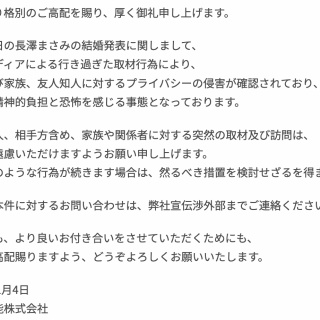 長澤まさみ結婚、所属事務所が声明 一部メディアによるプライバシー侵害「大きな精神的負担と恐怖を感じる事態」