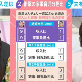 1. 匿名@ガールズちゃんねる http://times.abema.tv/articles/-/10215539 そんな夫婦の収入と家事負担の比率は、結婚当初「収入比 妻9:夫1」「家事負担比 妻9:夫1」だったという。「収入はほぼ私、チェリーさんが出せる分はちょっとだけ足してくれる感じで。最初の頃は張り切っていたので、『家事も私が全部やるから』みたいな。<中略>大変ではあったが、まだ結婚した当初だからラブラブでそれで良いと思っていた。これが子どもができたら変わってきた」(白鳥、以下同) その後、2021年の第1子誕生後も収入比と家事・育児負担比は変わらなかったという。「子どもが生まれた頃はちょうどコロナ禍で、仕事がばーっとなくなっていた時期でもあったので。特にチェリーさんは、営業に行くなどの外の仕事が多かったので、私が稼ぐのはしょうがないこと。でも家事・育児に関してはできるんじゃない?というのはすごく喧嘩した」。 そういった衝突も経て、2023年の第2子誕生後は、「収入比 妻7:夫3」「家事負担比 妻8:夫2」になったそうだ。「夫の収入もちょっと増えて、家事・育児もちょっと増えた。私からしたらだいぶ増えたと思う。これは私が細かく細かく言って、どうにか理解してくれるようになった」。 2025/12/21(日) 00:46:18