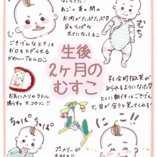 あとは、夜間まとまって寝てくれるようになりました💤😪💤大体3時間半~4時間、最大で5時間寝てくれてます😭長く眠ってくれるとパパママもまとまって眠れるのでありがたいですが、最初のうちはちゃんと生きてるかどうか不安になって頻繁に呼吸を確かめていました💦初めての予防接種も頑張りました!また詳しく描こうかな〜と思ってます😊