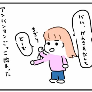 急にアンパンマンごっこを仕掛けてきました。よく分からないけど、パパは楽しくて元気になりました。指は食べてないと思うのですが、こういうセリフはアンパンマンにはなさそうだし・・・謎ですね。