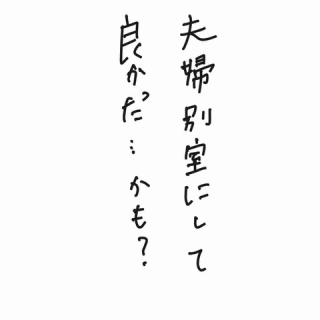 夫婦別室にして良かったのかどうかいまだに悩みます。自然と夜の夫婦生活も減るわけですし。自然消滅してしまいました。しかし私は早く寝て早く起きたいタイプ。朝からゆっくりしたいんです。そのためには早く寝たい。夫はダラダラしてから寝たいタイプ。朝はギリギリまで寝てたいみたいです。夜更かしも好きみたいで、転生もののアニメとか夜中に観てます。前は寝る前に少しその日あったことなどを私が一方的に話すと言うこともあったのですが、それはなくなり、今はすれ違った時の挨拶のみです。夫婦関係破綻してるのでは?と不安になります。でも仕事から疲れて帰ってきて、風呂→ご飯とノンストップで済ませて、早々と布団に潜り込みたい、そして寝たいという欲望には勝てません。三大欲求の中でも睡眠欲が一番大きいです。お互い自由にやれるのは最高ですが、自由過ぎて夫婦仲が悪くなるのも怖いんです。そこで挨拶ですよ。挨拶は私が起きてる限り、わざわざ部屋から出て夫のところへ行き、「おかえり」「おはよう」「おやすみ」これだけはなるべく言いに行っています。まあ、返ってくるのは「うん」の一言だけですが…無口な夫との会話はLINEが多いです。LINEでもスタンプくらいしか返してくれませんが…会話ができるくらいまで再構築したいものです。読んでくださりありがとうございました。