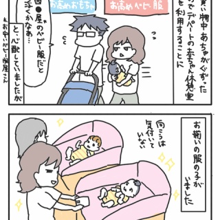 3人でお買い物に出かけた時の話の続き。その話はこちら。赤ちゃん休憩室は、おむつ交換台や授乳室やミルク用のお湯などが用意された施設のことです。ラル●ローレンやら、ミ●ハウスなどのデパートのお高めなベビー服屋さんの中を、西●屋の服を着せて歩いてると、ちょっとドキドキしました。数ヶ月しか着られないので、ベビー服はお安く済ませてしまっています。