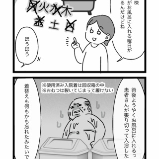 知り合いから新しい全裸ネタが入りました術後でようやくお風呂を許可された、還暦前後の患者さんいよいよ自分の時間が来て、いそいそとシャワーをあび、爽やかに浴室を出た時タオルや着替え一式を持ってくるのをすっかり忘れたと気付いたようですここの病院は、入院着を回収する箱が脱衣所に置いてあるのですが一度入れてしまうと取り出せない仕組みになっていて、さっきまで来ていたものを再度羽織るのは不可能にさらに履いていたオムツは、脱ぐときに手術箇所に触りたくなくて割いてしまったため、こちらも履けず頭を抱えてしまったようでした色々考えた結果、誰にも見つからないようにダッシュで部屋へ戻る という選択をした患者さん意を決して浴場を出たその瞬間、即リハビリ担当に見つかり止められたそうな「そういう時はナースコール押してね」と優しく言われてしおしおしていたみたいです今回は事故のようなものなんでしょうが、全身びしょ濡れのまま飛び出したわりにお見舞いに来た人たちや業者さんとかち合わなかったの、本当に運がいい人だなと思ったり…前回の全裸事件はこちらから読めます! にほんブログ村 にほんブログ村 にほんブログ村