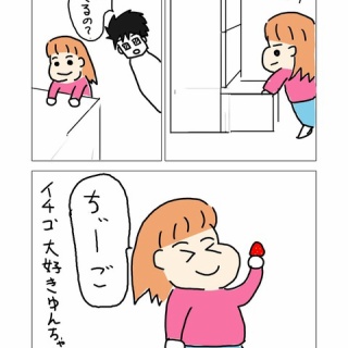 4コマじゃないマンガ形式に挑戦してみました。枠を考えたり、色を塗ったり難しいですね、もっと勉強しないとと思いました。今後もいろんな形式を試していきますので、温かい目で見守ってください。ゆんちゃんはいちごが大好きで、冷蔵庫にあるのが分かっていると漁って渡してきます。「ちぃーご」や「たべゆー」と言ってくるので可愛くて拒めません。最近は値段も安くなってきて、種類も増えてきていちごの季節を感じます。最近食べた中では「スターナイト」という品種が美味しかったです。