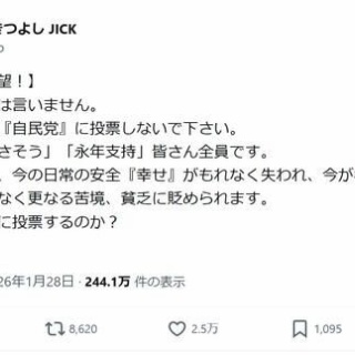 1. 匿名@ガールズちゃんねる http://www.nikkansports.com/general/nikkan/news/202601290000128.html この一連のポストに、「ごめんなさい。わからないのでお聞きします。お勧めの理由を教えてください」「気持ち悪すぎる投稿、逆効果」「『考えるな、従え。従わなければ不幸になる『という構図は、説得ではなく命令だ」「荒廃していく社会で暮らしたくないので自民に入れますわ」などの反発の声も多く寄せられた。 一方で、「表現の自由がなかなか行使出来ない不自由な業界で、よくぞ言ってくれました。これぞ本物の人間と真に尊敬致します」との声も。また、うじきの呼びかけをめぐり、自民、国民、参政の3候補しか立候補していない山口1区について「選びようがありません」、同様の香川2区についても「ひどすぎ。どうしたらいいんだ」とのポストも寄せられた。 2026/01/29(木) 11:19:19