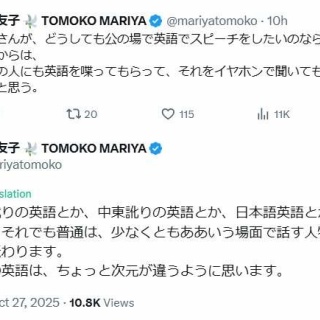 1. 匿名@ガールズちゃんねる 元宝塚歌劇団の女優毬谷友子(65) http://www.nikkansports.com/entertainment/news/202510280000164.html 毬谷は「高市さんが、どうしても公の場で英語でスピーチをしたいのなら、これからは、通訳の人にも英語を喋ってもらって、それをイヤホンで聞いてもらった方がいいと思う」と提言。 2025/10/28(火) 11:40:42