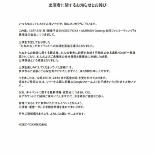 たぬかなさん、身の安全が確保されない為にイベント出演自粛へ