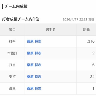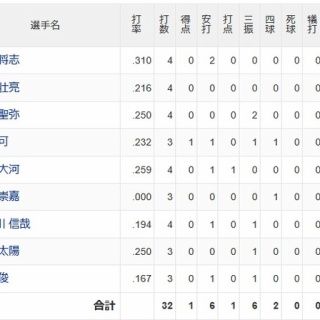https://baseball.yahoo.co.jp/npb/game/2021038724/stats1: 名無し 2026/04/16(木) 22:33:29.941 ID:TyiJ5p2uq 1(左)桑原 .310 1本 OPS.7942(遊)源田 .216 0本 OPS.5653(三)渡部 .250 0本 OPS.6644(指)林安 .232 1本 OPS.6995(捕)小島 .259 2本 OPS.6676(一) 山村 .000 0本 OPS.0777(右)長谷川 .194 0本 OPS.5288(二)佐藤 .250 1本 OPS.8759(中)秋山 .167 0本 OPS.333 2: 名無し 2026/04/16(木) 22:33:54.557 ID:TyiJ5p2uq チーム打率.208しかない模様