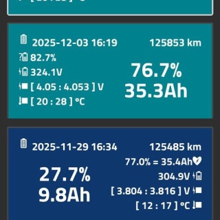 2025年12月3日時点での走行用バッテリー残量です。残76.7% 先月比 -0.3%走行距離 125853Km 先月比 +1439Kmバッテリー走行比率 47.3% 先月比 +0.4%充電回数? 1129回 先月比 +20回ガソリン ¥11,733 (74.7L)急速充電 ¥1161+月額基本料金 ¥1,000 = ¥2,161自宅充電 ¥5,463 202Kw (太陽光発電時充電分 -¥0) 買電分 ¥5,463経費計 ¥19,357 ¥13.45/Km走行用バッテリーは、0.3%の減でした。順調に減ってはいますが、まだまだ安心はできません。冬期間になり毎日エンジンが掛かる様になりましたので、車に掛かる経費が多くなってきました。PHEV車でもガソリンは安いに越したことはありませんね。走行用バッテリーの無償交換期限まで残り1年と4ヵ月(2027年4月) 距離は3万4千147キロ