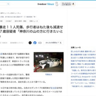 1 : 足立区暴走11人死傷、歩行者はねた後も減速せず…37歳容疑者「神奈川の山の方に行きたいと思った」 - ライブドアニュース 東京都足立区梅島の国道4号で盗難車が暴走し、11人が死傷した事故で、車が歩道で歩行者をはねた後も減速せず、車道のトラックに追突していたとみられることが捜査関係者への取材でわかった。 車は当時パトカーの追跡を受けており、警視庁は車の窃盗容疑で逮捕した同区の職業不詳の男(37)が摘発を免れるため、逃走を図ったとみて調べている。 男は調べに「車を盗んだわけではなく、試乗するために店から出た」と容疑を否認。「車で神奈川県の山の方に行きたいと思っていた」とも話している。同庁は今後、ひき逃げや危険運転致死傷の疑いでも捜査するが、男には精神疾患があり、刑事責任能力の有無を慎重に確認している。全文はソースで 3 : また基地外無罪か 4 : キチガイは何してもいいからなあ