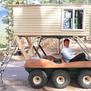 I Built A Tiny Camper That Can Go Anywhere @Dad Vlogs 水陸両用のどこにでも行ける小さなキャンピングカーを作ってみた動画。 改造元となったのは小さな水陸両用車。 まずはこのバギーの上にベニヤ板を乗せ、フロアを作成。 これを中心に骨組みを組み、ベニヤを貼り付け壁を作成。 キャンパー部分はベルトで車体に固定。 そして壁に穴をあけ、窓も設置。 キャンパー後部には扉を設置し、ここから中に入れるようにしておきます。 入口へは折りたたみ式の梯子を利用して到達。 外壁には防水シートとトタンを貼り付け防水加工を施します。 屋根にもトタンを貼り付ければ完成となります。 完成したのにバギーに問題が起きたのは悲しいですね。