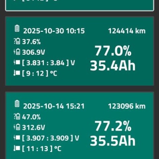 2025年10月30日時点での走行用バッテリー残量です。残77.0% 先月比 -1.3%走行距離 124414Km 先月比 +1965Kmバッテリー走行比率 46.9% 先月比 +0.1%充電回数? 1109回 先月比 +21回ガソリン ¥16,824 (104.29L)急速充電 ¥1655+月額基本料金 ¥1,000 = ¥2,655自宅充電 ¥4,081 151Kw (太陽光発電時充電分 -¥0) 買電分 ¥4,081経費計 ¥23,560 ¥11.98/Km走行用バッテリーは、1.3%の減でした。ここ数ヶ月0.2%しか減っていなかったのですが、一気に1.3%の減です。去年も一気に1.3%減ったことがありました。しかも10月末の計測同じ時期に一気に減るのは何か原因があるのかと思い調べて見た所、バッテリーの温度が高温あるいは低温の時は数値がリセットされないまた走行可能距離が0になってから普通充電で満充電にして100%の状態を2時間以上維持することで数値がリセットされる 等の書き込みを発見。この辺が関係しているんですかね。とりあえず走行可能距離を0にして普通充電で満充電+2時間上放置して1.3%の減となりました。今月は距離も乗ったし急速充電も5分以内を13回とこまめに負荷を掛けました結果何が原因で減ったのかは解らなくなりましたが、とりあえず減ったので良しとします。購入時84.8%で現在77.0%=16ヵ月で7.8%の減=1ヶ月あたり0.4875%の減保証期間の残りは17ヵ月なので、このペースでいくと68.7125%となりなんかと70%を切りそうなペースです。ただしこれからは冬期間となりエンジンメインでの稼働となりますのでこの辺がどう影響してくるかですよね・・・来月は急速充電をやめて様子をみます。走行用バッテリーの無償交換期限まで残り1年と5ヵ月(2027年4月) 距離は3万5千586キロ