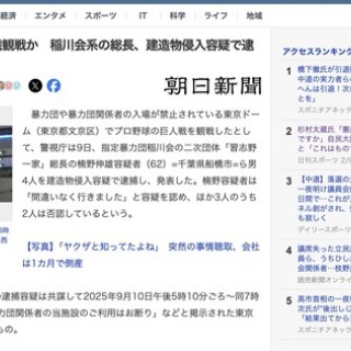 1 : 東京ドームで巨人戦観戦か 稲川会系の総長、建造物侵入容疑で逮捕(朝日新聞) - Yahoo!ニュースhttps://news.yahoo.co.jp/articles/ecd5bc46e0f7a83f93d5180ffd7ee21a28a1c76f 暴力団や暴力団関係者の入場が禁止されている東京ドーム(東京都文京区)でプロ野球の巨人戦を観戦したとして、警視庁は9日、指定暴力団稲川会の二次団体「習志野一家」総長の楠野伸雄容疑者(62)=千葉県船橋市=ら男4人を建造物侵入容疑で逮捕し、発表した。楠野容疑者は「間違いなく行きました」と容疑を認め、ほか3人のうち2人は否認しているという。 富坂署によると、4人の逮捕容疑は共謀して2025年9月10日午後5時10分ごろ~同7時5分ごろ、「暴力団及び暴力団関係者の当施設のご利用はお断り」などと掲示された東京ドームに侵入したというもの。 捜査関係者によると、午後6時開始の巨人対広島戦を、三塁側のシーズンシートで見ていたという。試合開始前、ドーム関係者が入れ墨がある人物を入り口付近で発見し、防犯カメラで確認するなどした上で110番通報した。 このシーズンシートは、千葉県内の産業廃棄物収集運搬業者名義で購入されていた。全文はソースで