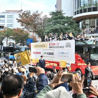 圧倒的な強さでリーグ優勝を果たした阪神タイガース。前回から2年ぶりのリーグ制覇。残念ながら、日本シリーズでは苦杯をなめたものの、今年は本当に大いに楽しませてもらったシーズンだった。 その阪神タイガースが、大阪のメインストリートである御堂筋でリーグ優勝の記念パレードを行うという。これは行かねばなるまい、と見に行ってきた。 今回のパレードはリーグ優勝を記念して、御堂筋の淀屋橋から心斎橋の手前までの約2kmで行われた。選手たちは3台のオープンバスに分乗し、ファンに感謝を伝えるために1時間ほどかけてゆっくりと進んだ。普段は車で埋まる大通りが、この日ばかりは虎党たちの歓喜の空間に変わった。 澄み渡る青空の下、早めに観覧エリアに入って待つこと数十分。事前に誰がどのバスに乗るのかは発表されていたが、選手たちが東西どちらの車線側に立つのかは、現場に行ってみないと分からない。 やがて淀屋橋を出発した選手たちが、遠くに見えてきた。バスが近づくにつれて大きくなる声援は、地鳴りのようだった。自分はユニフォームもタオルも応援グッズも持ってこなかったけれど、一年間のありがとうの感謝を込めて手を振った。 選手会長の中野は、興奮と感動で前ばかりを見ていたように見えた。来シーズンは背番号が変更になる。この「51番の中野」を見るのは、これが本当に見納めなのだと思うと、何だかしみじみとした気持ちになった。 佐藤輝明も今シーズンは本当に凄かった。その隣には、残留が確定した梅野の顔も見える。来年の活躍にも大いに期待したい。 坂本が守備の要でガッチリとリードしていたのが大きい。来シーズンはFAで日ハムから伏見が加入するし、梅野も含めてベテラン3人がどのような役割分担になるのか。 歓喜と興奮が交錯するパレードは、あっという間に心斎橋方面へと遠ざかっていった。やっぱり、生の選手を見るのは格別だ。今シーズンは甲子園で観戦することができなかったが、来年こそは見に行きたい。