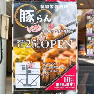 【追記】※情報ありがとうございました。オープン日が判明しました。↓こちら上記貼紙によると、11月25日オープン予定とのこと。まだ店内は工事中のようでしたが、11時から営業するようなのでランチも楽しめそうですね!南林間に「豚らん」というサムギョプサル専門店ができるようです。↓こちら この場所には以前「心(シン)」がありました。見に行った時は工事中。以前の写真↓比べてみると、すでに看板は変わっていました。地図ではここ↓住所は神奈川県大和市南林間2-13-2。建物全体。「豚らん」は、看板を見る限りサムギョプサル専門店。系列店や公式SNSの情報は見つからず。オープン日も不明です。目立つ看板でいつオープンするのかも気になりますね!詳細情報が分かり次第、また紹介したいと思います。■関連リンク ※情報ありがとうございました!大和とぴっくでは読者さんからの情報提供をずっと待ってます!やまとぴと一緒に大和情報を充実させませんか?お店ができた!あそこで工事してる!などなど些細なことでも大丈夫です!★情報提供はコチラ★