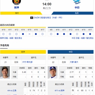 【ドラゴンズ実況】4/18 中日vs阪神(甲子園)14:00~先発:大野雄大【中継:CBC スカイA DAZN他】