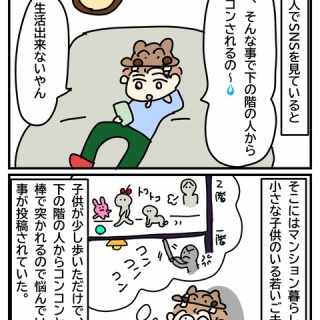 これは昔、マンション暮らしをしていた頃のお話です。マンションは生活しやすくて暮らしやすかったんですが。ちょっと困る事がありました。それは、、上の階の人は男の人で、だぶん一人暮らしだったと思うんですが、たまに彼女らしき人が来て色々部屋の掃除なんかをするんですね。それは良いんですが、マットとか色んなものをパンパンベランダの手すり部分に叩きつけて、ゴミを下に落とすんです。。😭布団なんか干していたら、びっしりゴミクズがのかっていて、気持ち悪いのなんの。。かなり非常識な彼女さんだなと思いながら、陰キャのカバ子は文句を言う勇気が無かったのでした。カバ子に占い漫画描いて欲しい人❣️ポチッとお願いします🤲 占いランキングオリジナルイラストランキングWeb漫画ランキング絵日記ランキングにほんブログ村