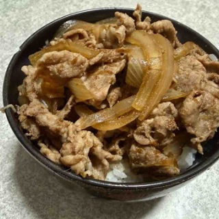 豚丼。https://youtu.be/EZlBM3s_PVU?si=3T_Y4BzIOo5xam0W下準備①玉ねぎを輪切りにしておく。②鰹節を600wで40秒レンチンして細かく鰹粉にしておく。行程①鍋に玉ねぎ、水、みりん、しょうゆ、砂糖、味の素、鰹節を入れて沸騰させる。②沸騰後5分ほど蓋を閉めて煮立たせる③肉を細かく一枚ずつ刻んで入れてさらに5分煮立たせる④白米の上によそって完成感想実際には砂糖、鰹節、生姜は目分量で。少し鰹節多かったのでその味が強めだが美味しい。肉の臭みもないのでどんどん食べれる。梅雨が結構余ってくれるので汁だくでさらに美味しい。