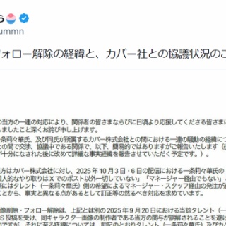 管理人注:当ブログでは基本的に噂や憶測を広めるような記事は作成しない方針なのでスルーしていましたが、2ヶ月ほど前にりりか社長の親絵師であるなかむら先生から社長へのフォロー解除と共に、それまで投稿していた社長関係のイラストの全削除が行われており、何らかのトラブルが伺われる状態が続いていました。今回なかむら先生本人からの声明に加え、カバー側からも公式声明が出たということで、リスナー側にも周知されるべき情報であると考え関連内容をまとめました。342: ホロちゃんねる 2025/12/10(水) 17:54:06.83 なかむら先生から表明出たけど何が言いたいのかよくわからない