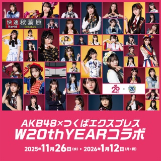 『つくばエクスプレス』×『AKB48』がコラボ『AKB48×TX W20 周年記念デジタルスタンプラリー』が11月26日から2026年1月12日まで開催されます。 『AKB48×TX W20 周年記念デジタルスタンプラリー』 (1)開催期間 2025年11月26日(水)~2026年1月12日(月・祝) (2)参加方法 スタンプスポット設置駅をまわり、駅構内に掲出されているポスターにある二次元コードをスマートフォンまたはタブレットで読み取り、デジタルスタンプを入手してください。 ※どちらの駅からでも始められます。 ※参加費は無料です。ただし、ご参加に必要な交通費や、端末や通信料については参加者のご負担となります。 ※スマートフォン等の充電残量にご注意ください。 ※歩きスマホはご遠慮ください。 (3)スタンプスポット設置場所 【つくばエクスプレス設置スポット】 8駅:秋葉原駅、浅草駅、北千住駅、三郷中央駅、流山おおたかの森駅、守谷駅、みどりの駅、つくば駅 スタンプスポット設置時間:初列車~終列車 【AKB48特別スポット】 AKB48劇場 ※AKB48劇場内へは公演チケットをお持ちの方のみがご入場できます。 ※公演チケットをお持ちでない方も参加できるスポットを追加予定です。詳細は後日、特設サイトよりご確認ください。 (4)景品 ①スタンプ4個集めるごとに必ずもらえる! 【メッセージ付きフォトカード(全42種/ランダム)】「メッセージ付きフォトカード」は、全国のファミリーマート、ミニストップ、ローソンの店内マルチコピー機にて印刷が可能なプリント番号がお手持ちの端末に表示されます。 ※印刷は無料です。 ※メッセージ付きフォトカードに成田香姫奈は含まれません。 ※印刷可能期間および印刷方法等の詳細は特設サイトからご確認ください。 〇引換期間 2025年11月26日(水)~2026年1月20日(火) ②スタンプ9個コンプリートで当たる! 【サイン入りポスター(全5種/各4名様)orメッセージ付きフォトカード(全42種/計200名様)】 デジタルスタンプラリーのスタンプスポットをめぐり、スタンプを9個取得された方にAKB48メンバーの直筆サイン入りB1ポスター(全5種/各4名様)またはメッセージ付きフォトカード(全42種/計200名様)が抽選で当たります。 ・いずれかの希望景品を選択のうえ、ご応募いただけます。「サイン入りポスター」は全5種から選択可能です。「メッセージ付きフォトカード」は全42種から選択可能です。 ・「メッセージ付きフォトカード」は、全国のファミリーマート、ミニストップ、ローソンの店内マルチコピー機にて印刷が可能なプリント番号が当選者に送信されます。 ※印刷は無料です。 ※メッセージ付きフォトカードに成田香姫奈は含まれません。 ※印刷可能期間および印刷方法等の詳細は特設サイトからご確認ください。 〇応募期間 2025年11月26日(水)~2026年1月20日(火) 2. AKB48中づりジャックの列車運行 車両内の中づり広告をAKB48がジャックします。 (1)運行期間:2025年11月26日(水)~2026年1月12日(月・祝) (2)運行編成数:1編成(6両) (3)運行区間:つくばエクスプレス線 秋葉原駅~つくば駅間 ※運行情報については、TX公式ホームページ(https://www.mir.co.jp/)にてお知らせします