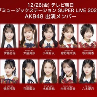 豪華60組超に!『Mステ SUPER LIVE 2025』第2弾出演アーティスト&コラボ企画解禁 - テレ朝POST 豪華60組超に!『Mステ SUPER LIVE 2025』第2弾出演アーティスト&コラボ企画解禁 テレ朝POST (出典:テレ朝POST) AKB48 姉妹グループとして日本国内にSKE48・NMB48・HKT48・NGT48・STU48が、日本国外にJKT48・BNK48・MNL48・AKB48 Team SH・AKB48 Team TP・CGM48・KLP48がある。AKB48に姉妹グループを含めた場合には「AKB48グループ」、「AKBグループ」、または「48グループ」と総称される。… 375キロバイト (33,895 語) - 2025年12月17日 (水) 11:23 (出典 オリコンニュース) テレビ朝日「Mステスーパーライブ」にAKB48が出演するとのこと、今年も年末が楽しくなりそうです!アイドルたちのパフォーマンスがどのように進化しているのか、特に新しいメンバーの活躍に期待しています。次世代のアイドルたちがどんなパフォーマンスを見せてくれるのか、楽しみにしています!(出典 【速報】AKB48 テレビ朝日「Mステスーパーライブ」出演者発表 キタ━━━(゚∀゚)━━━━!!)1 (2級) :2025/12/19(金) 21:04:52.67 Ⓜ❄🕶⋆ ━━━━━━ #MステSUPERLIVE #AKB48 出演メンバー発表📢 ━━━━━━ ⋆🕶❄Ⓜ #大島優子 さん #高橋みなみ さん #小嶋陽菜 さん #指原莉乃 さんと こちらの現役メンバー18名で❕ ☑︎RIVER ☑︎ポニーテールとシュシュ ☑︎ヘビーローテーション をメドレーで披露します🎙👱🏻♀🫧 来週12/26(金)16:30〜 お楽しみに✊🏻🩵🤍 #Mステ @Mst_com #AKB48_20thYear (出典 i.imgur.com) VIPQ2_EXTDAT: none:none:1000:512:donguri=0/4: EXT was configured (出典 static.sanyonews.jp)(出典 【速報】AKB48 テレビ朝日「Mステスーパーライブ」出演者発表 キタ━━━(゚∀゚)━━━━!!)