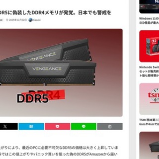 1 : 米AmazonでDDR5に偽装したDDR4メモリが発覚。日本でも警戒を DRAMの品薄や値上がりにより、最近のPCに必要不可欠なDDR5の価格は大きく上昇しています。そんな中、海外ではこの値上がりやパニック買いを狙った偽のDDR5がAmazonから届いたという事例が報告されています。 DRAMの品薄や価格高騰によりDDR5の価格は暴騰しており、2025年上半期と比較して現在の価格は3~4倍に達しています。EXPOやXMPに対応していないベーシックな16GB×2枚セットのDDR5でさえ、6万円を超える価格で販売されている状況です。 そんなDDR5ですが、この価格高騰に目を付けた詐欺業者がDDR4モジュールにDDR5製品のヒートシンクを取り付け、Amazonへ流通させているようです。 RedditユーザーのLeading-Growth-8361氏がAmazon.comからCorsair Vengeance DDR5メモリキット(2枚組)を購入したところ、PCへの組み込み時にマザーボードのスロットへ物理的に装着できないことが判明しました。全文はソースで 3 : 絶対あると思ったわwww