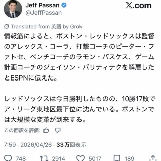 1: 名無し 2026/04/26(日) 09:24:05.238 ID:P4Sr319L2 吉田正尚のレッドソックスに激震 コーラ監督と主要コーチ陣の解任で大幅テコ入れ レッドソックスが25日(日本時間26日)、アレックス・コーラ監督と主要コーチ陣を解任したと発表した。 コーラ監督の他、ラモン・バスケス・ベンチコーチ、ピーター・フェイト打撃コーチ、カイル・ハドソン三塁コーチ、ディロン・ローソン打撃コーチ補佐、ジョー・クロニンMLB打撃戦略コーチが解任され、球団OBの元捕手で戦略などを担当していたジェーソン・バリテク・コーチは別のポジションに配置転換する。 チームには吉田正尚外野手(32)が所属しているが、今季は外野陣の人数がだぶつき、コンスタントに出番がない状況が続いていたhttps://news.yahoo.co.jp/articles/9b11320a53596183f6a1f1a852fdaedea937c583 2: 名無し 2026/04/26(日) 09:24:48.923 ID:nbm3CaKfn マサどうなるんや