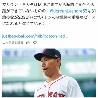 1: Red★速報 2026/01/06(火) 17:02:01.24 ID:9u3S4v0U0 https://twitter.com/justbb_media/status/2008195995516223674?s=46Though Masataka Yoshida hasn't lived up to his contract since coming to MLB, our @JordanLeandre55 still believes the 32-year-old can still be an important piece of Boston's offense in 2026:https://t.co/NyyXLb2lij— Just Baseball (@JustBB_Media) January 5, 2026