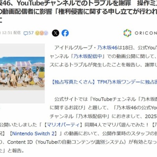 乃木坂46、YouTubeチャンネルでのトラブルを謝罪 操作ミスで一部の動画配信者に影響「権利侵害に関する申し立てが行われる事態」に・・・