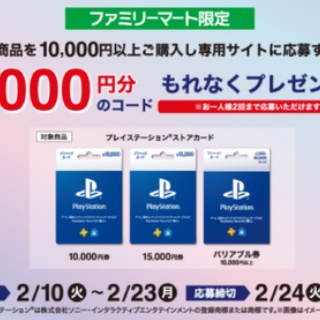 [PS] ファミリーマートにて、PSストアカード10,000円以上購入・応募すると、PSストアコード1,000円分がもれなくもらえるコードキャンペーン (2026年2月10日より)