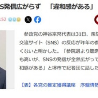1 : 参政神谷氏、SNS発信広がらず 「違和感がある」 | NEWSjp -共同通信 参政党の神谷宗幣代表は31日、衆院選で活用している交流サイト(SNS)の反応が昨年の参院選の時と比べ芳しくないと明かした。「参院選より聴衆は多く、党員の熱量も高いが、SNSの発信が全然広がっていない。ちょっと違和感がある」と堺市で記者団に話した。 同時に「今まではX(旧ツイッター)で拡散されていたが広がらず、3分の1ぐらいに減っている」と説明。原因を分析し対策を講じたいとした。 https://news.jp/i/1390301814020195037