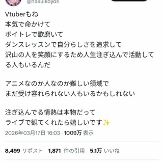 230. 名無しのリスナー これはいつも応援してくださっている皆様、ありがとうございます!このあと私からお知らせがあります少し悲しいですが、あまり心配しすぎず前向きに聞いてもらえると嬉しいです!よろしくお願いします!!!— KMNZ NERO | ネロ (@kmnznero_) March 16, 2026 【ご報告】声帯結節という病気の可能性が高いと診断を受け、一部の活動をお休みします!息をするのと同じくらい当たり前で、命の次に大切な「歌」が突然歌えなくなる時が来るのだと、とても不安だったけど落ち込むのとかもう飽きたぜー!また君の前で全力で歌うために前向くから、待っててくれ‼️ https://t.co/UipfaltjoA pic.twitter.com/UFXLQEuEMN— KMNZ NERO | ネロ (@kmnznero_) March 16, 2026 2026/03/16(月) 21:30:38.30 ID:1KOpcfoo