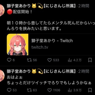 574. 名無しのリスナー 剣持ホイホイおはよぉ ちょっとだけツイッチでろりでもしようかなぁ— 獅子堂あかり🐱💫【にじさんじ所属】 (@44do_akari) October 22, 2025 2025/10/22(水) 13:07:46.36 ID:HC1PA4AZ