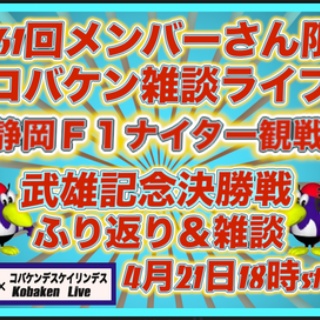 本日のメンバーさん限定コバケン雑談ライブは 平日なので普段なら20時ぐらいからなんですが 今回は18時からになります そこで静岡F1ナイターに追加あっせんとなった 野中龍之介と丸山留依のレースをみます そのあとに別途 静岡F1ナイターのライブ配信も行います 新山響平vs犬伏湧也がありますよ! 時間都合つけて 参加よろしくお願いします 第161回メンバーさん限定 コバケン雑談ライブ 武雄記念決勝戦&静岡F1ナイター観戦 ふり返り&雑談 4月21日18時start ↓ https://youtube.com/live/hm7LX6IOTM4 チャンネル登録・メンバー登録 サブチャンネル登録そしてDMM競輪加入 そしてAmeba🦠ブログもよろしく!