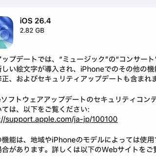 AppleがiPhoneなど向けiOS 26.4とiPadOS 26.4をリリース! Appleは24日(現地時間)、同社が販売するスマートフォン(スマホ)「iPhone」シリーズ向けプラットフォーム「iOS」とタブレット「iPad」シリーズ向けプラットフォーム「iPadOS」の最新バージョン「iOS 26.4(23E246)」および「iPadOS 26.4(23E246)」を提供開始したとお知らせしています。また同社では合わせてより古いiPhoneやiPadなど向けに「iOS 18.7.7」および「iPadOS 18.7.7」、パソコン「Mac」向け「macOS Tahoe 26.4」、スマートウォッチ「Apple Watch」向け「watchOS 26.4」、スマートテレビ「Apple TV」向け「tvOS 26.4」、スマートヘッドセット「Apple Vision」向け「visionOS 26.4」なども配信開始しています。 変更点は新たに「ミュージック」アプリに「コンサート」機能や「フリーボード」アプリに「Apple Creator Studio」が追加されるほか、アクセシビリティにおいて「明るいエフェクトを減らす」や「視差効果を減らす」などが改善され、またワイヤレスヘッドホン「AirPods Max 2」への対応や8個の新しい絵文字の追加、素早くタイプ入力したときのキーボードの正確さが向上するなどが行われており、さらにさまざまな不具合や脆弱性が修正されているということです。 なお、セキュリティーアップデートについてはCVEに登録されているKernel関連の「CVE-2026-28868」や「CVE-2026-28867」、「CVE-2026-20698」、「CVE-2026-20687」、WebKit関連の「CVE-2026-20665」や「CVE-2026-20643」、「CVE-2026-28871」、「CVE-2026-20664」、「CVE-2026-28857」、「CVE-2026-28861」、「CVE-2026-28859」などの38個の脆弱性が修正されているということです。 対象機種はiOS 26.4では最新の「iPhone 17」シリーズ(「iPhone Air」含む)を含めたiPhone 11シリーズ以降やiPhone SE(第2世代)以降が対象、iPadOS 26.4ではiPad(第8世代)以降やiPad mini(第5世代)以降、iPad Air(第3世代)以降、12.9インチiPad Pro(第3世代)以降および11インチiPad Pro(第1世代)以降のiPad Proシリーズが対象で、各製品にて無料で更新可能です。なお、iOS 18の対象機種だったiPhone XSシリーズおよびiPhone XR、iPadOS 18の対象機種だったiPad(第7世代)はそれぞれ対象外となり、対象外の機種ではそれぞれiOS 26やiPadOS 26にはアップデートできないのでご注意ください。